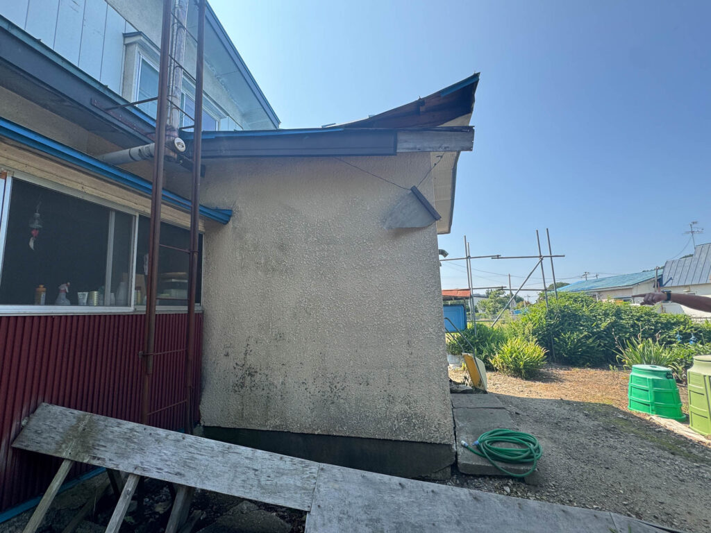 青森市のK様より、「屋根の軒が大きく曲がっている」「外壁トタンが剥がれそうで心配」とのご相談をいただき、板金工事・軒折れ補修工事を実施いたしました。