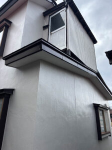 今回の工事では、浮きや剥がれを除去し、左官で下地を整えたうえで吹き付け塗装を行いました。