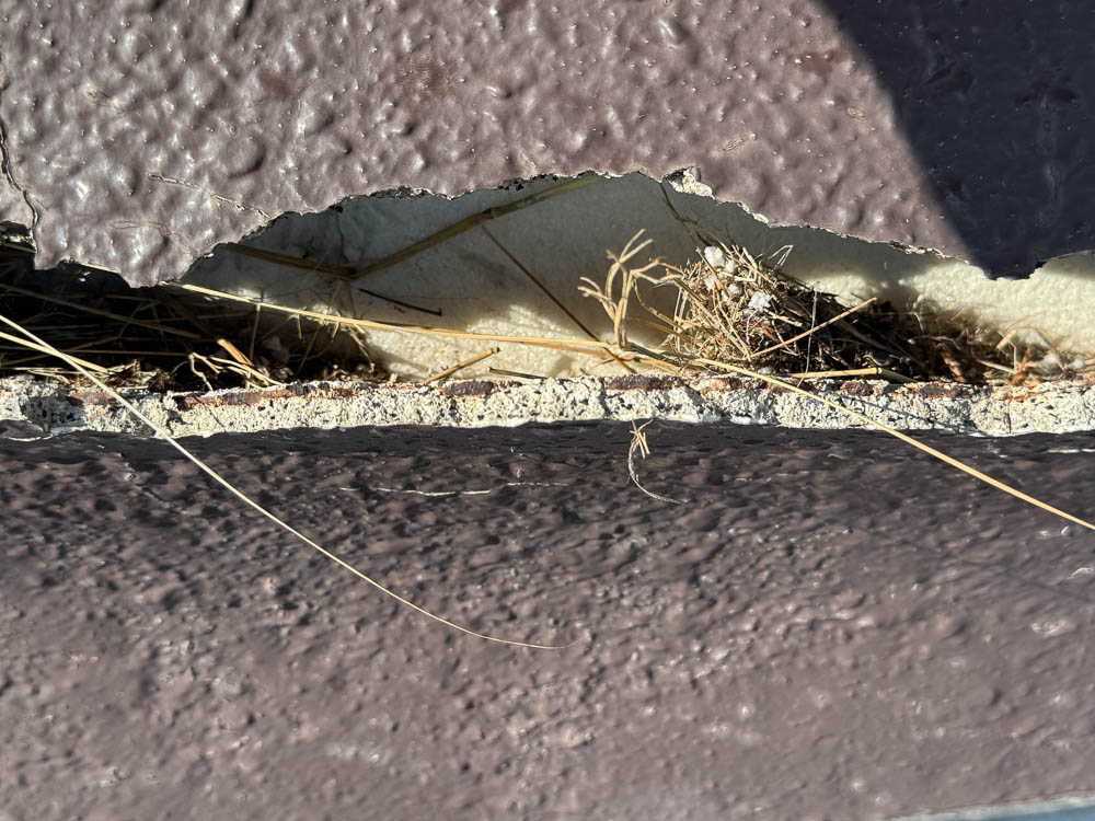 「外壁が剥がれてきている」とのご相談をいただき、調査の結果、外壁の一部で塗膜が浮き、剥がれた箇所から草やゴミが入り込んでいる状態でした。